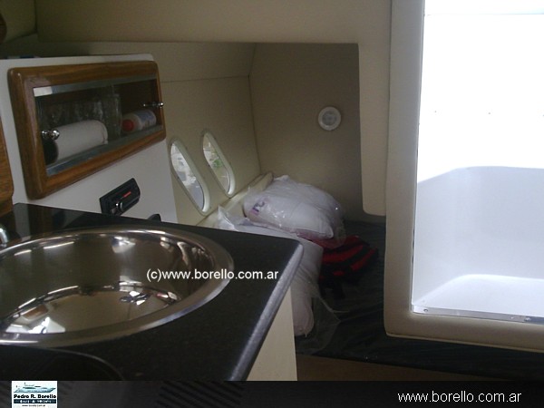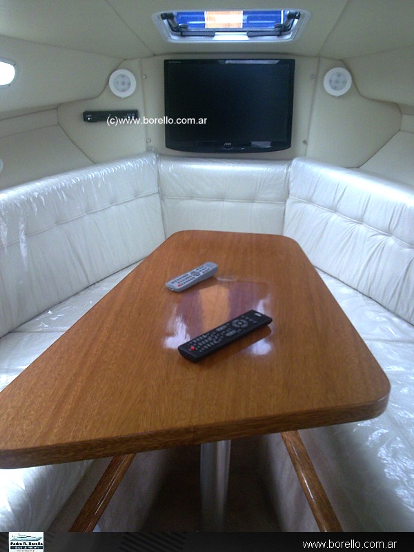Mesa dinette convertible en cama en (V), amplia conejera con cama doble, baño compartimentado con indoro eléctrico y bacha, cocina con mesada, cockpit con asiento timonel y acompañantes. |