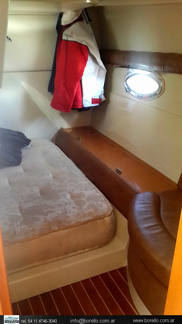 Amplia cama doble en proa, sofá, dinette, cocina. Amplio camarote en popa compartimentado. Cockpit con asiento doble timonera, sillón enfrentado y asiento a popa envolvente con mesa central. Plataforma de popa incorporada con puerta de ingreso, solárium a proa sobre cubierta. |