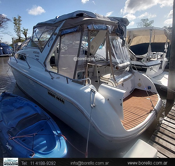 Muy buen estado general, pasillos laterales hacia solárium de proa. Moderno y veloz. Motor Volvo Penta KAD 42 Turbo Diésel Compresor, pata Volvo Duoprop. |