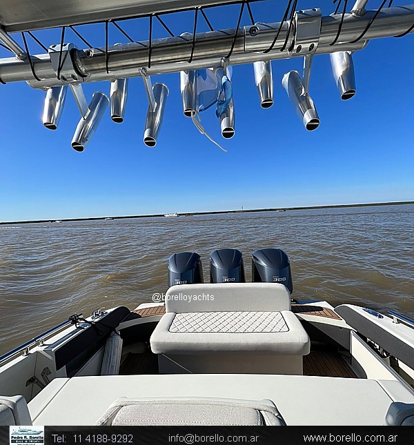 Nueva propulsión del modelo más versátil de la flota, ampliando las posibilidades de navegar con doble motorización fuera de borda de 300 hp cada uno, con resultados sorprendentes: navegación segura, divertida, y un rendimiento superador. Un generoso bracket sostiene los motores y modifica la planchada de popa. Los fuera de borda brinda múltiples ventajas: más espacio interior en sector de sala de máquinas; navegación silenciosa; fácil planeo; mejor velocidad; trimado de motores y transmisiones para que estas últimas queden fuera del agua. Un producto de excelencia. Bajo cubierta, monovolumen con cama doble en proa, cocina completa, baño con ducha y un camarote popel con dos camas. |