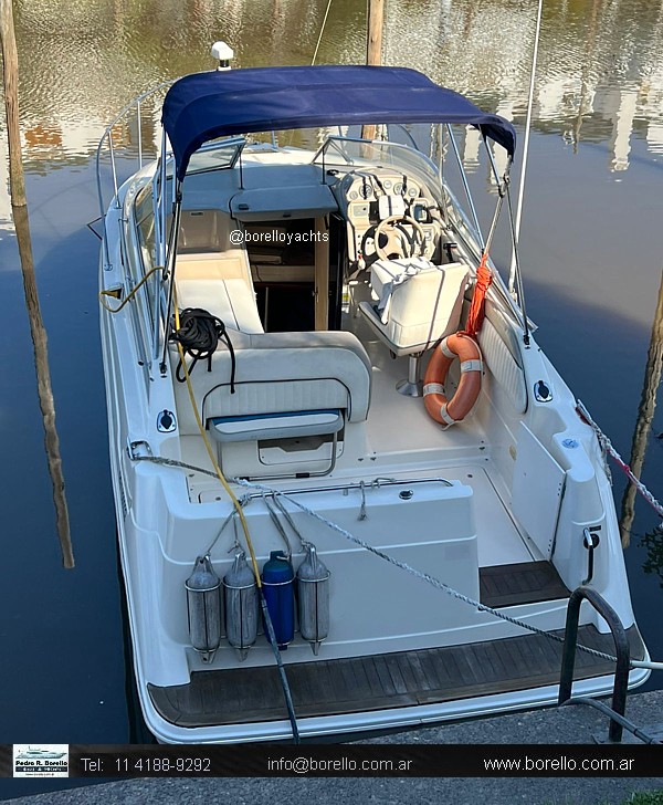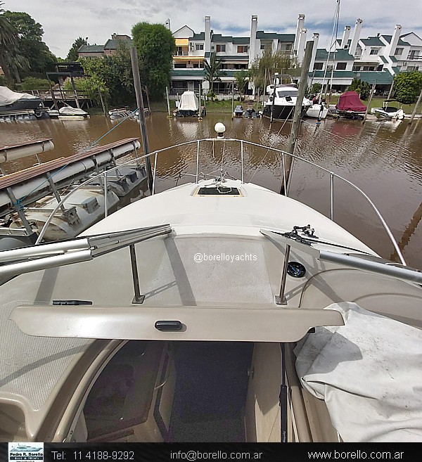 Mesa dinette a proa convertible en cama matrimonial en V, baño compartimentado con inodoro eléctrico, sector cocina, conejera en popa, cockpit con plataforma incorporada y puerta de acceso. Solárium a proa sobre cubierta con paso por parabrisas. |