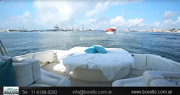 Camarote principal en suite, 2 camarotes de invitados, baño de invitados, amplio salón, buen cockpit con solárium en popa, asiento timonel y acompañantes, pasillos laterales hacia solárium de proa sobre cubierta. |