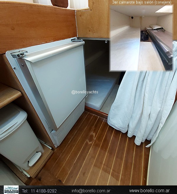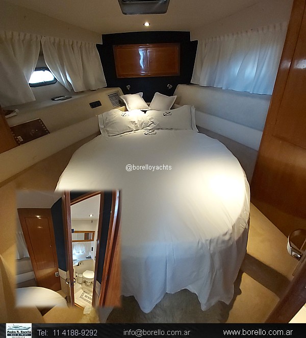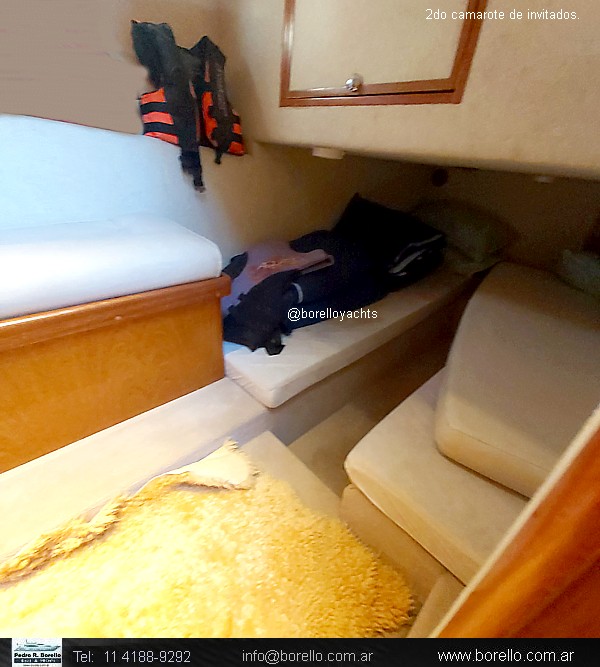 Camarote a proa cama matrimonial al centro con baño en suite, camarote de invitados con 2 camas paralelas, baño de invitados, camarote tipo conejera bajo salón, cocina, salón timonera con 2 sofás enfrentados y mesa central, cockpit con asiento en L, bacha y puerta de acceso desde plataforma de popa, pasillos laterales hacia solárium de proa sobre cubierta, doble comando con asiento timonel y acompañantes. |