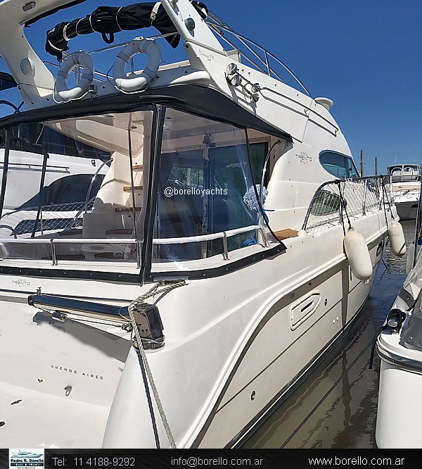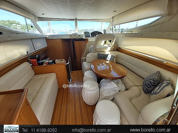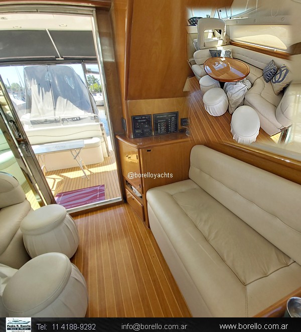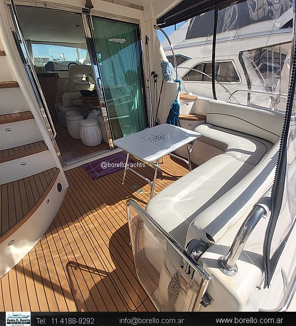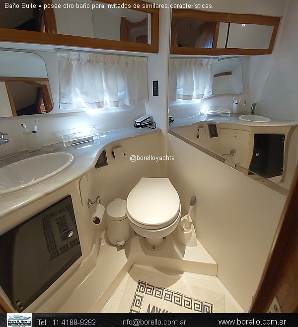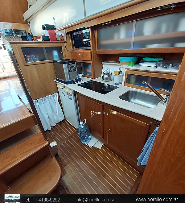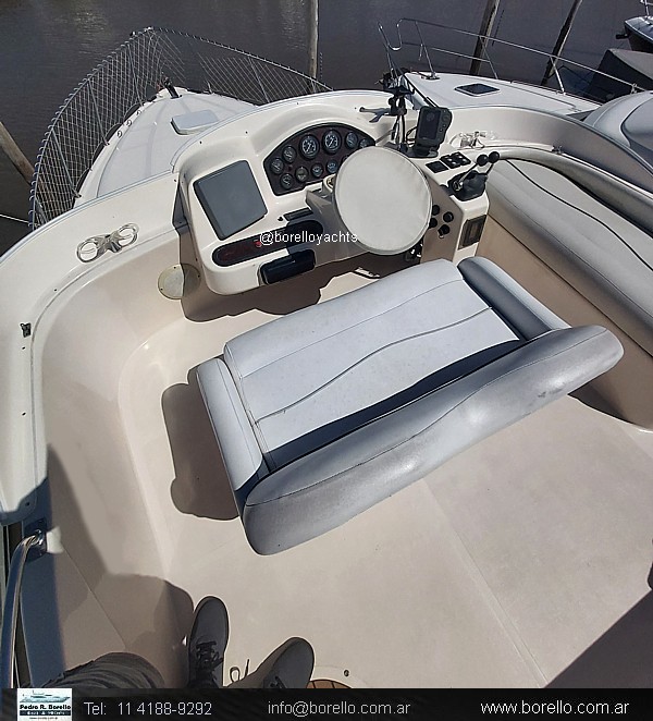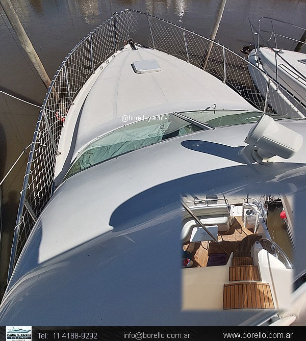 VHF, ecosonda, compás, grupo electrógeno diésel, aire acondicionado f/c, calefactor Webasto, heladera, fabricadora de hielo, GPS/plotter, flaps, audio en interior y en fly, cocina vitrocerámica, horno microondas, inodoros eléctricos en ambos baños, ducha, termotanque agua caliente, teca en cockpit y escalones fly, colchonetas, cerramiento de cockpit completo, malacate eléctrico.. |