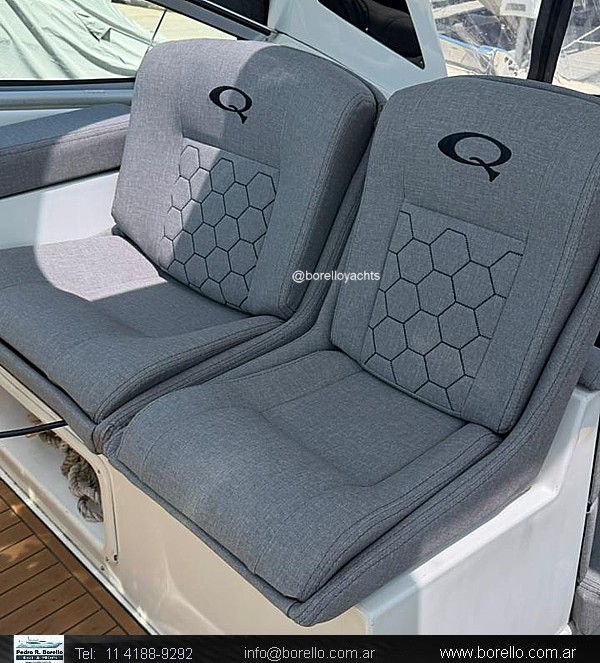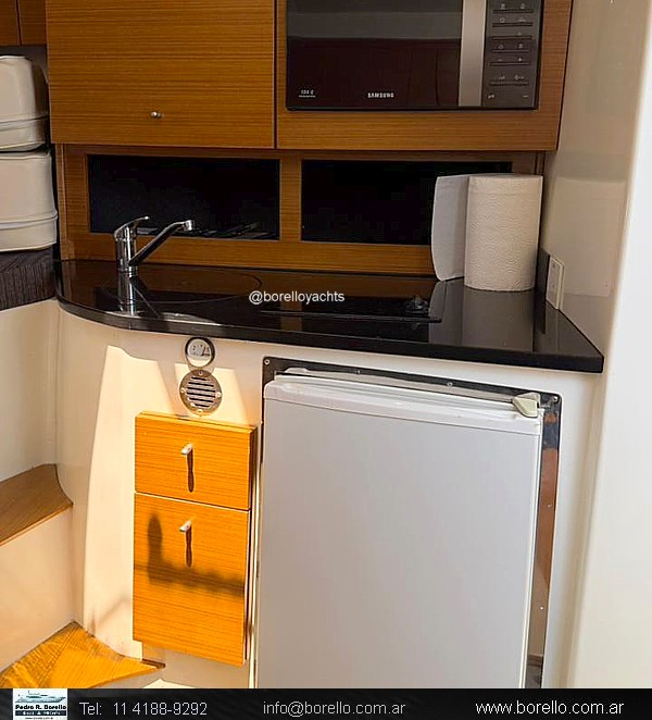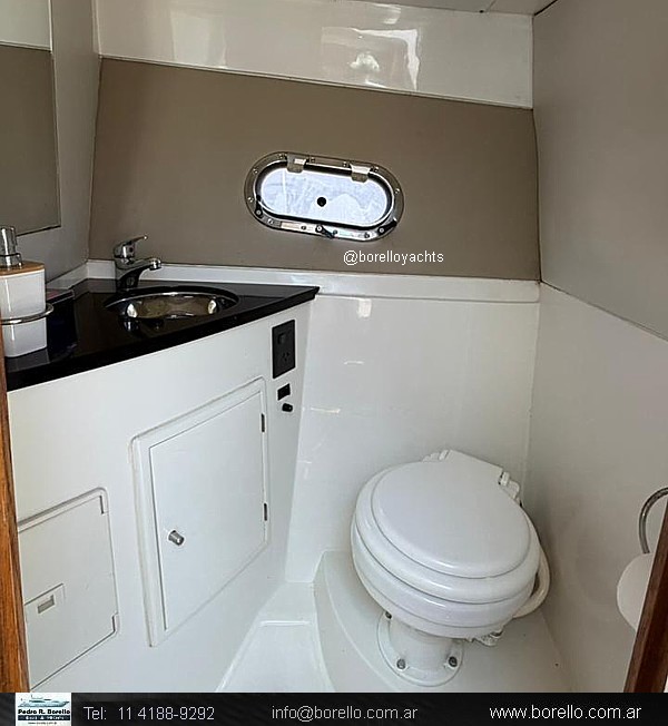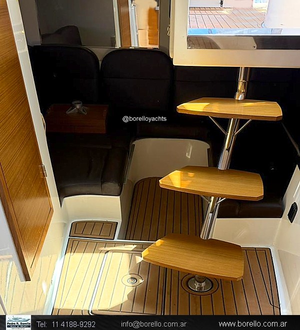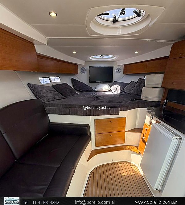 Cama doble a proa, cocina, baño compartimentado, conejera doble en popa, cockpit timonera con asiento timonel y acompañante, otro asiento lateral y sofá en ele con mesa central, mueble de guarda y bacha lavamanos, plataforma incorporada con puerta de ingreso, solárium a proa sobre cubierta. |