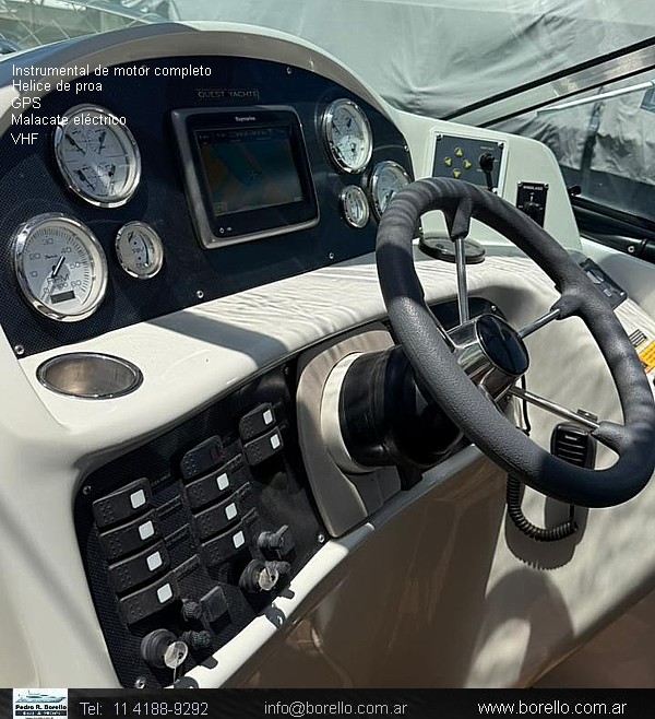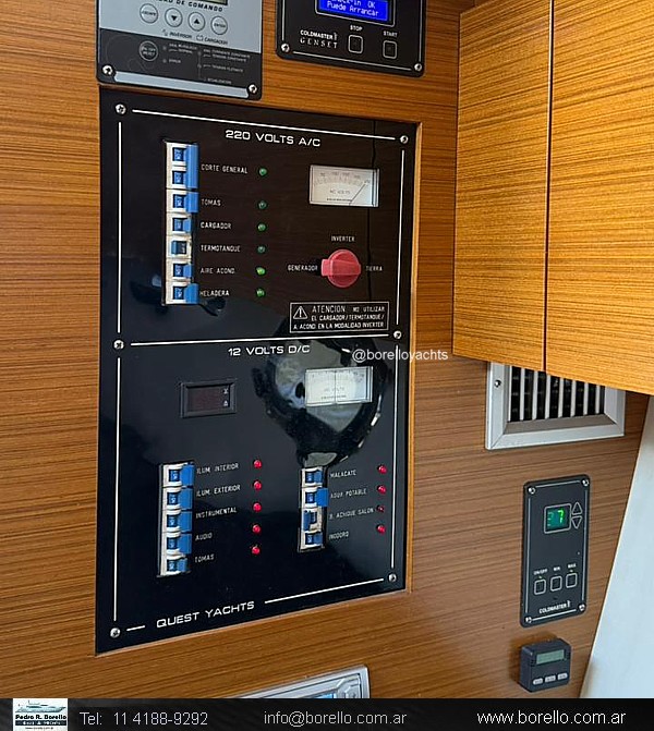 VHF, GPS/Plotter, BowThruster (hélice de proa), faro a control remoto, horno microondas, compás, ecosonda, malacate eléctrico, carpa completa, toldilla y cerramiento completo, heladera, inodoro eléctrico, ducha agua caliente, toma tierra 220 V., fláps hidráulicos, inverter 12/220 v., audio, TV.. |