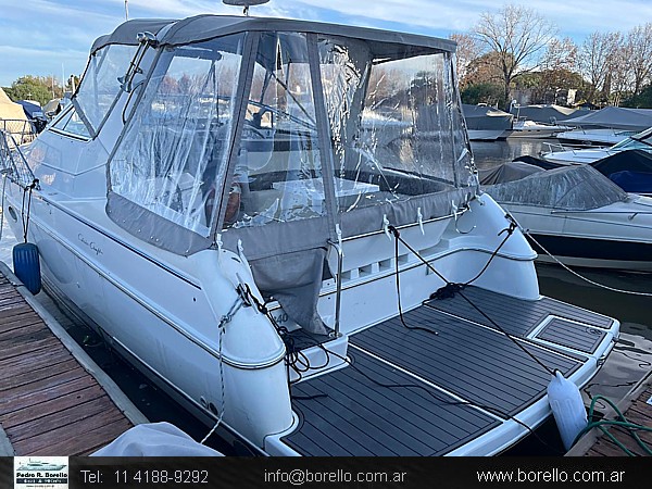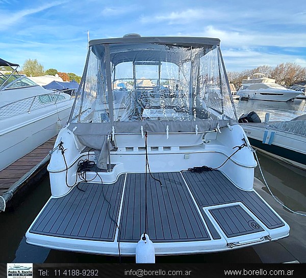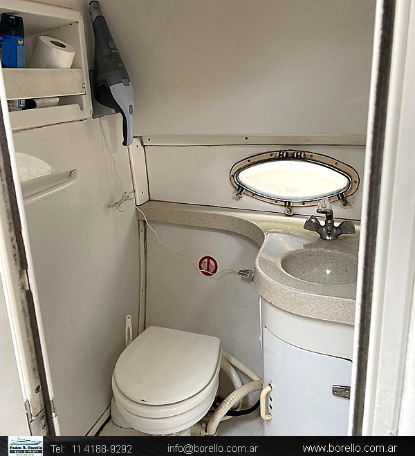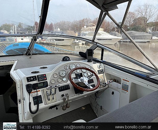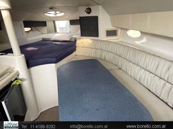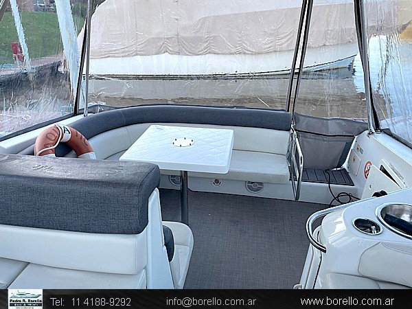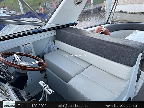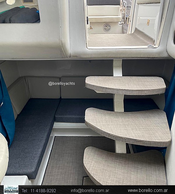 Camarote a proa abierto con cama matrimonial, sector dinette, cocina, conejera doble, cockpit con asiento timonel y acompañante, sofá en forma de U con mesa central, solárium a proa sobre cubierta, plataforma de popa de medidas generosas. |