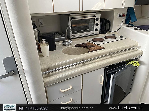 VHF, ecosonda, compás, malacate eléctrico, faro a control remoto, grupo electrógeno, aire acondicionado, convertidor, red perimetral en proa, malacate eléctrico, toldilla y cerramiento de cockpit, toma tierra 220 V., anafe eléctrico 2 hornallas, horno eléctrico, heladera eléctrica, cobertor sector cockpit.. |