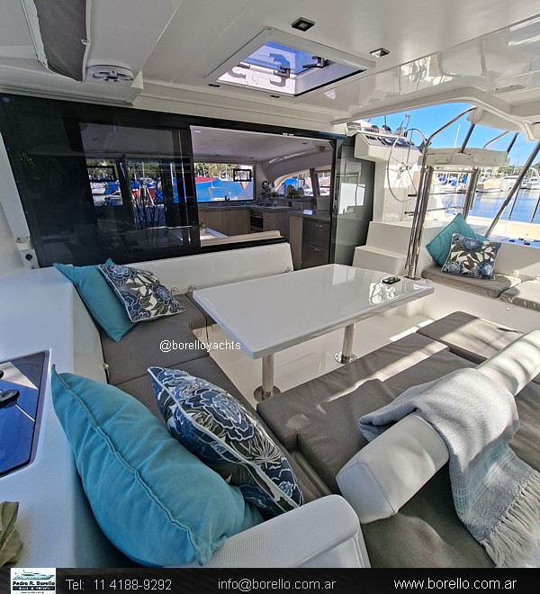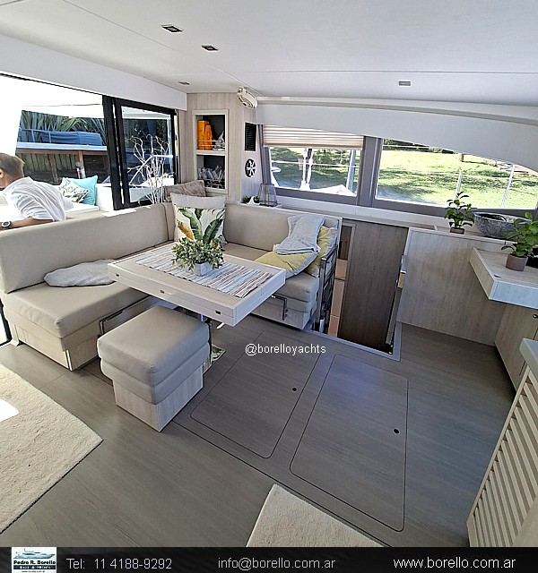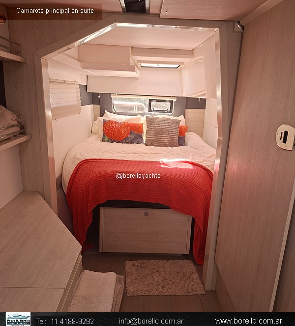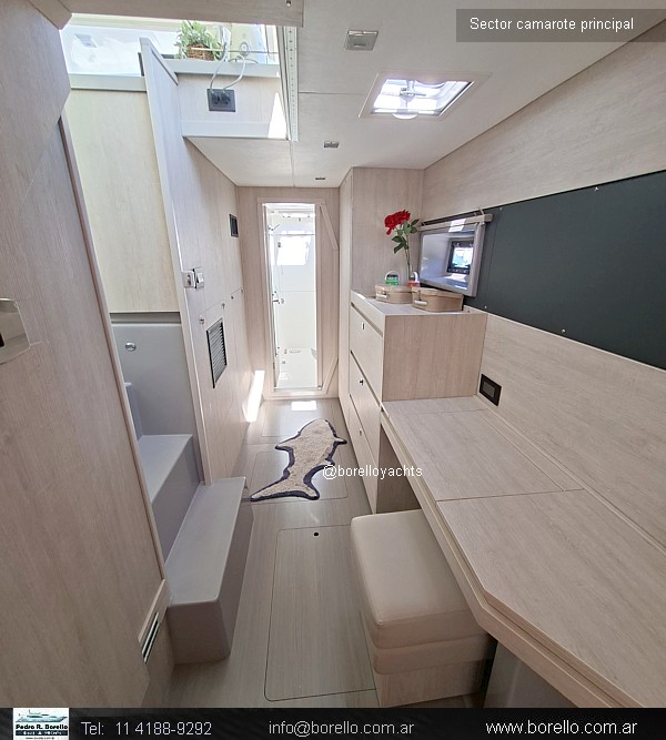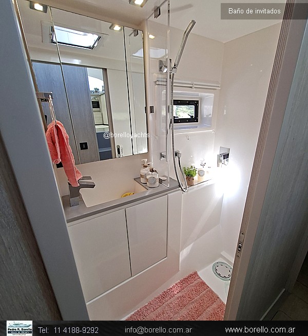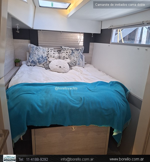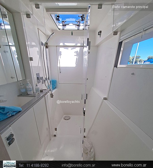 Amplio cockpit con sofá en forma de U con mesa central, sofá enfrentado, todo techado con tambuchos de abrir y cerramientos media sombra, sector timonera techada, ingresando salón central con mesa dinnette, sector cocina, mesa de navegación y lugares de guarda, bajando sobre estribor camarote principal con baño en suite con ducha compartimentada y muebles laterales en todo el pasillo, desde el salón bajando a babor disponemos de un 2 camarotes para invitados con camas dobles, baño de invitados y en proa como extra tenemos un espacio compartimentado con cama que se puede utilizar o bien cama marinero o invitado. Desde el salón hacia proa accedemos a un generoso solárium con lugares de guarda varios y al sector lona de proa utilizable también como solárium. Acceso al barco desde popa por 2 plataformas en las bandas y un espacio plano en popa para maniobra de atraque o bien accionamiento del pescante de accionamiento eléctrico para el bote chinchorro. |