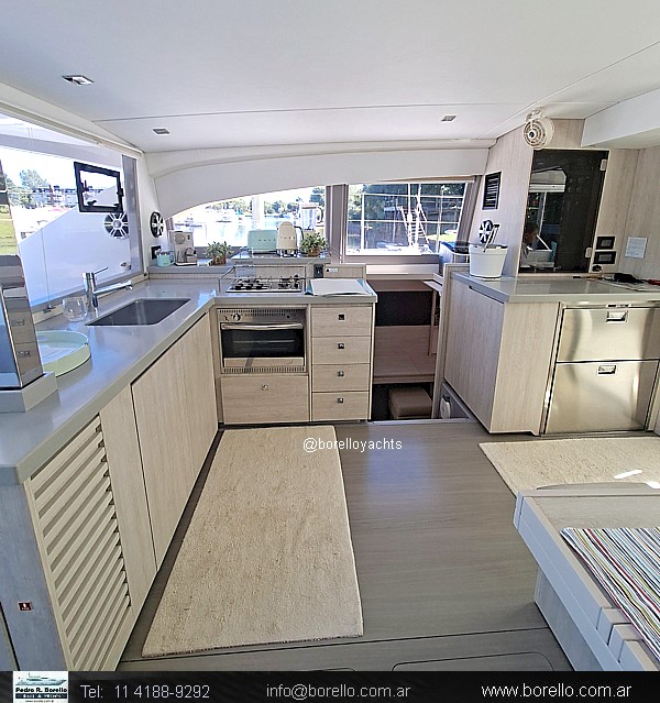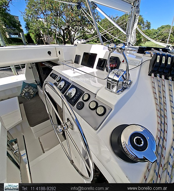Malacate/pescantes de accionamiento eléctrico, Bombas de achique con alarmas, Medidores de tanques agua potable (total 780 lts.), 2 aires acondicionados Crusair 16.000 BTU c/u, grupo electrógeno 5.5 KVA., 2 termotanques agua caliente, baños con inodoros eléctricos y bidematic, bombas de transferencia de combustible entre tanques, radar color, sistema AIS 650, convertidor 12/220 V., malacate eléctrico, luces de iluminación bajo el barco, audio Fusion Marine potenciado con 10 parlantes, piloto automático, instrumental multifinción Raymarine, Ancla 20 Kg. con 50 metros de cadena. En velas posee Mayor con lazy Jack, 2 enrrolladores Genoa y código Cero. (Mirate el video recorriendo el barco apretando la flechita de la última imágen). |