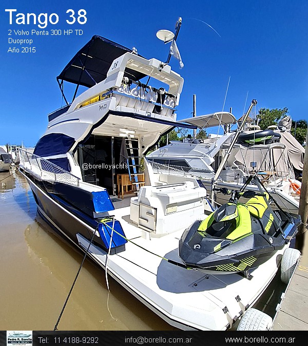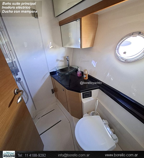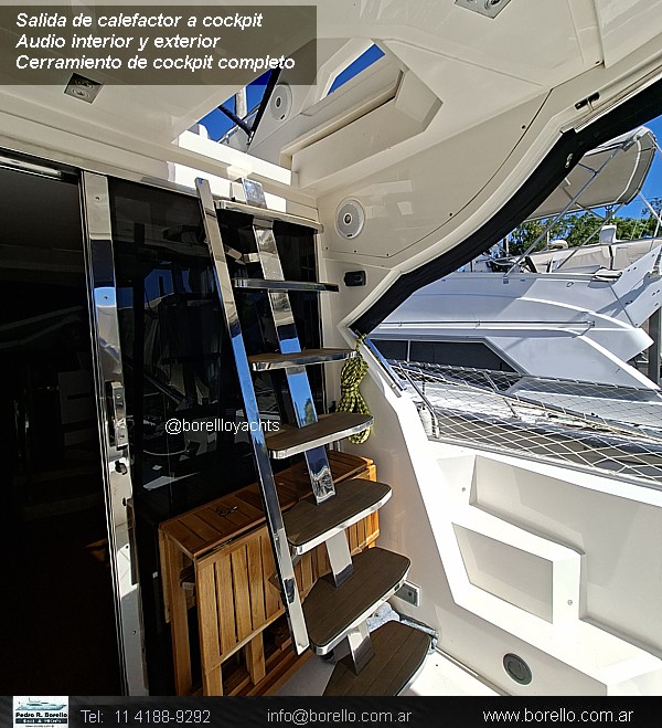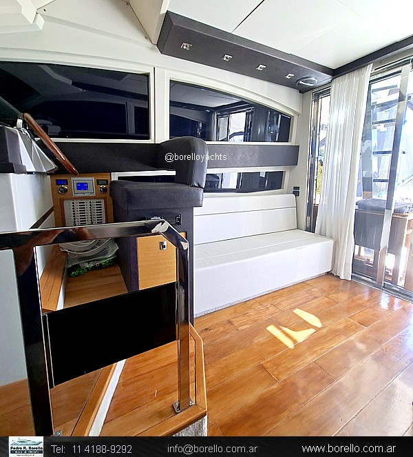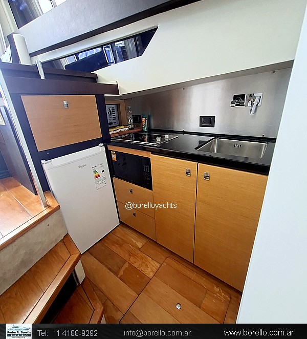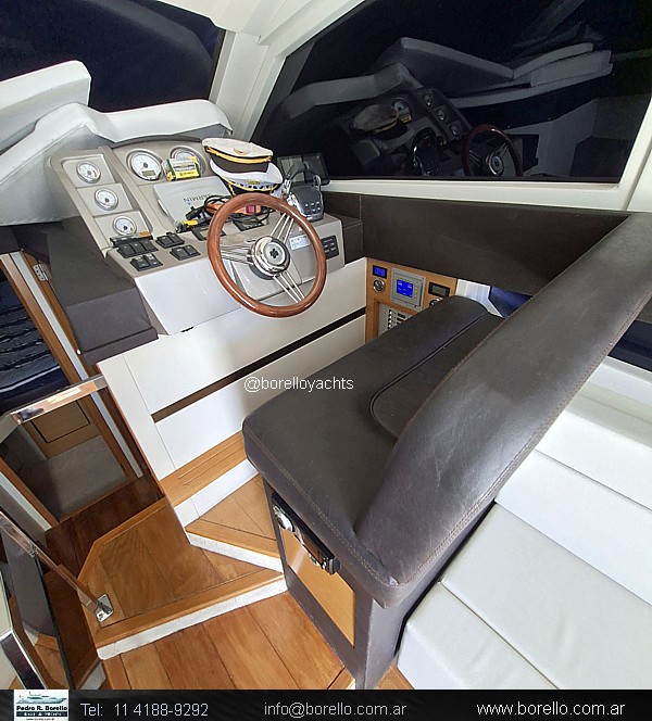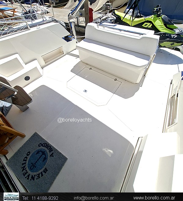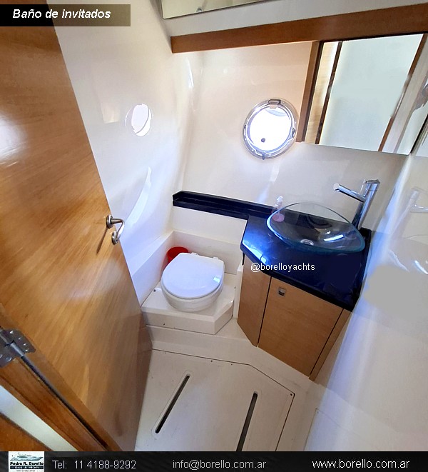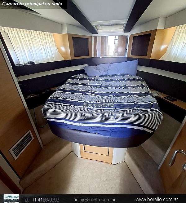 Camarote a proa cama al centro con baño en suite, camarote invitados con 2 camas paralelas, baño de invitados, cocina, salón timonera con sofá y mueble TV enfrentado, cockpit con doble puerta de acceso desde plataforma de popa, plataforma de generosas dimensiones, pasillos laterales hacia solárium de proa sobre cubierta, doble comando con asiento timonel y acompañantes. |