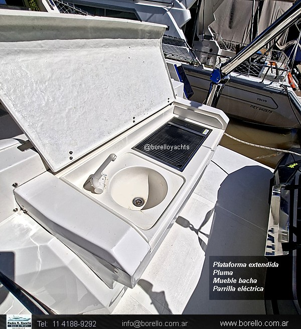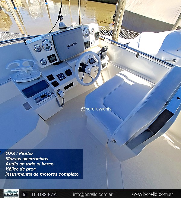 VHF (2), ecosonda, compás, GPS / Plotter con repetidor, hélice de proa, audio potenciado con parlantes en todo el barco, grupo electrógeno, 2 aires acondicionados, calefactor, convertidor 127220 V. Vectrom 3000 W., heladera eléctrica, horno microondas, cocina 2 hornallas eléctrica, bombas automáticas presurizadas todas, toma tierra 220 V., pluma, red perimetral, malacate eléctrico, colchonetas sol proa, toldilla fly, cerramiento cockpit, carpa, cubre vidrios. (Vea el video haciendo clic en la flechita roja y más fotos haciendo clic en la pestaña "Mas Fotos"). |