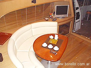 Generador Kohler 10 Kva. con caja acústica, 2 equipos de aire acondicionado (24.000 BTU totales), Piloto automático con repetidor, compás electrónico, 2 VHF, 2 Correderas, pescantes en ac. inoxidable con malacates eléctr., malacate eléctrico para fondeo, colchonetas proa para sol, Timones hidráulicos y comandos Hynautic, limpiaparabrisas electr., bombas achique aut. (Rule), fondeo tipo Danforth con cabo y cadena, plataforma de baño con escalera revatible, toma a tierra 220 v., pisos alfombrados, termotanque, filtro agua mar, 2 extractores de aire, Hélices en bronce y ejes en inox., baños con inodores eléctricos, heladera eléctr. 220 v. con frezzer, cocina electrica 220 v., piso en cocina en madera plástificado, arco radar, audio AM/FM/CD.. |