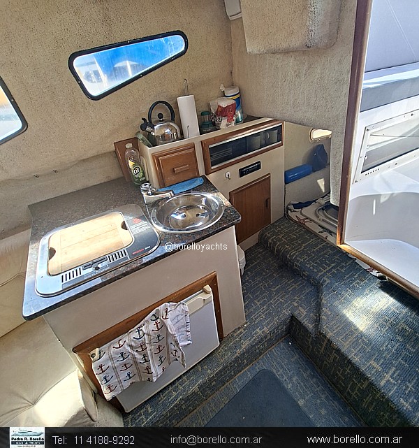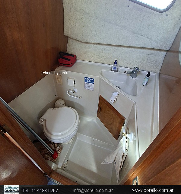 Mesa dinette convertible en cama en (V), amplia conejera con cama doble, baño compartimentado con indoro eléctrico y bacha, cocina con mesada, cockpit con asiento timonel y acompañantes, solárium a proa con colchonetas tela gris claro. |