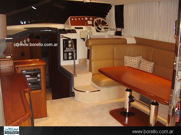 Amplio salón timonera, con mesa dinette con sofá en (U), mueble TV enfrentado, cocina en desnivel, camarote principal a proa con cama matrimonial al centro, (2) camarotes de invitados, uno con (2) camas superpuestas, y el otro con 3 camas, 2 marineras y una enfrentada, baño compartimentado completo, amplio cockpit, pasillos a solarium de proa y fly |