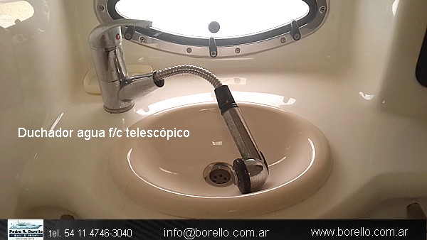 Mueble parrilla en popa, toldilla y cerramiento completo de cockpit, colchonetas sol proa, Malacate eléctrico, Aire acondicionado marino, calefacción con salida en salón interior y cockpit (Webasto), hélice de proa (Bowthruster), Cocina eléctrica, horno Microondas, heladera, Sistema de agua presurizada fría/caliente con termotanque, Innverter y cargador 12/220 V., Grupo electrógeno Diesel. (Vea mas imágenes de esta embarcación haciendo clic en la pestaña "Mas Fotos"). |