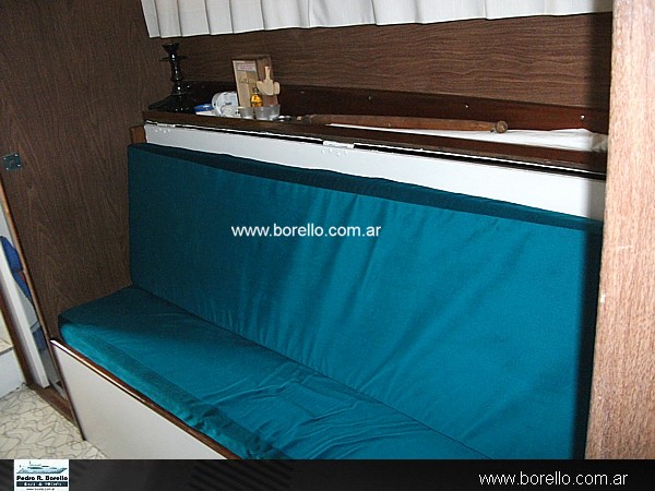 Excelente espacio interior con Camarote de proa cerrado con baño en suite, dinette convertible en cama , enfrentada a sillon convertible en dos amplias cuchetas superpuesta. Mueble de cocina completo con cocina, heladera y lugares de guarda, baño con mueble y bacha. Salon timonera con sillon convertible en cama y timonera. Cockpyt apto para mesa , plataforma de baño. Muy cómodos pasillos, Amplio solarium en proa. |
