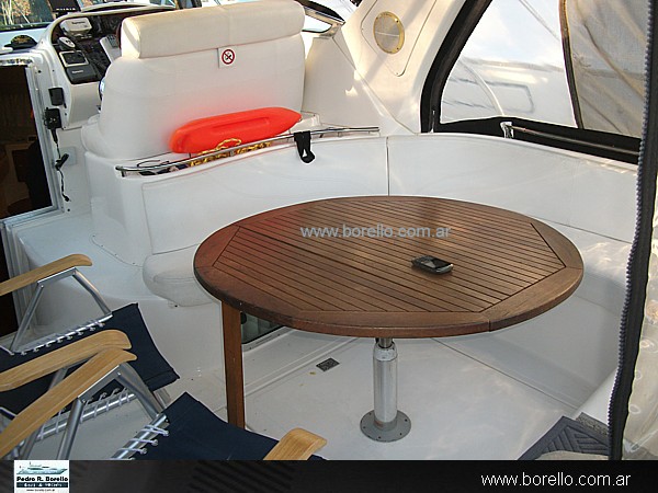 Dos camaras de seguirdad infrarrojas una sobre sentina otra sobre arco radar.Chartplotter Garmin , Equipo de audio. Reoljeria completa de los dos motores. dos ecosondas. VHF. Compas. Cocina. Microondas. Heladera.Tv. LED 27 . Webasto. Cargador inteligente. Webasto ( calefactor a gasoil ), Freezer en cockpit, microondas, Flaps . Cerramientos completos. Carpa completa. Planchada extendida recubierta en madera. . |