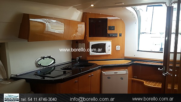 Mesa dinette en forma de U en proa convertible en cama doble, cocina con amplia mesada y lugares de guarda, camarote en popa compartimentado con cama doble, baño en suite con doble puerta con inodoro eléctrico y bidematic, en el exterior timonera con sofá enfrentado para acompañantes, sillón en ele (L) con mesa en triángulo, mueble bacha con fabricadora de hielo empotrada, plataforma de popa grande revestida en Teca, solárium a proa sobre cubierta. |