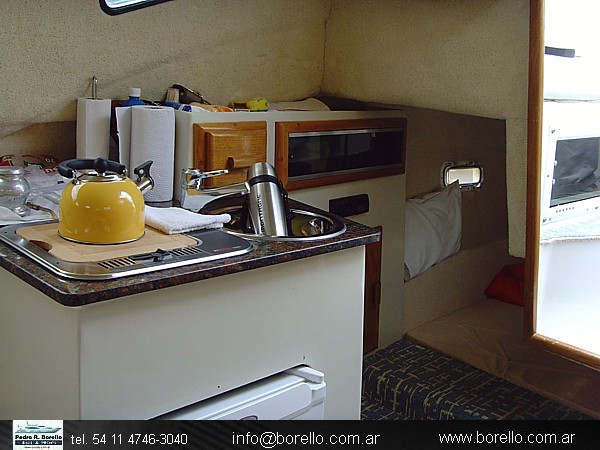 Sofá en V a proa con mesa central convertible en cama doble, cocina, baño compartimentado con inodoro eléctrico, conejera doble a popa, cockpit con asiento timonel y acompañantes, plataforma incorporada con puerta de acceso, solárium a proa sobre cubierta. |