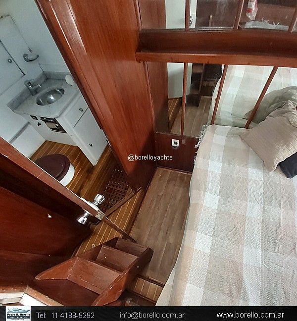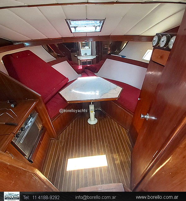 En proa sillón en V convertible en cama doble, sector cocina, baño compartimentado de proa, cockpit central con mesa dinette y asientos timonel y acompañantes, camarote en popa con cama doble y baño en suite, solárium en proa y popa sobre cubierta. |