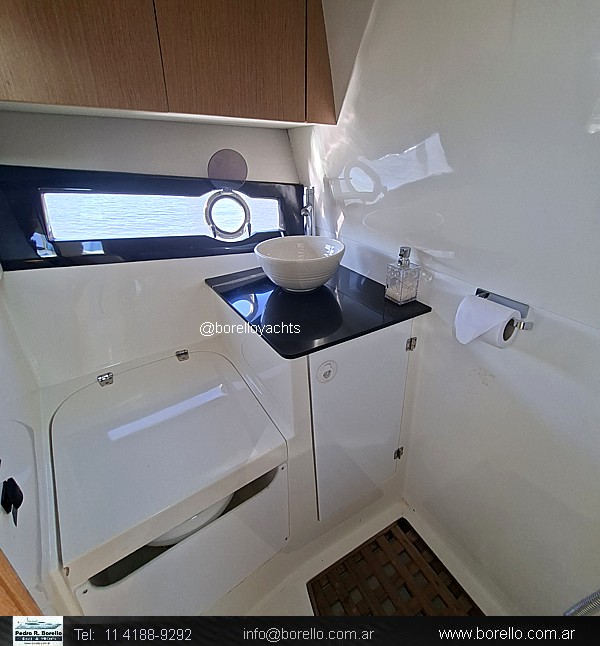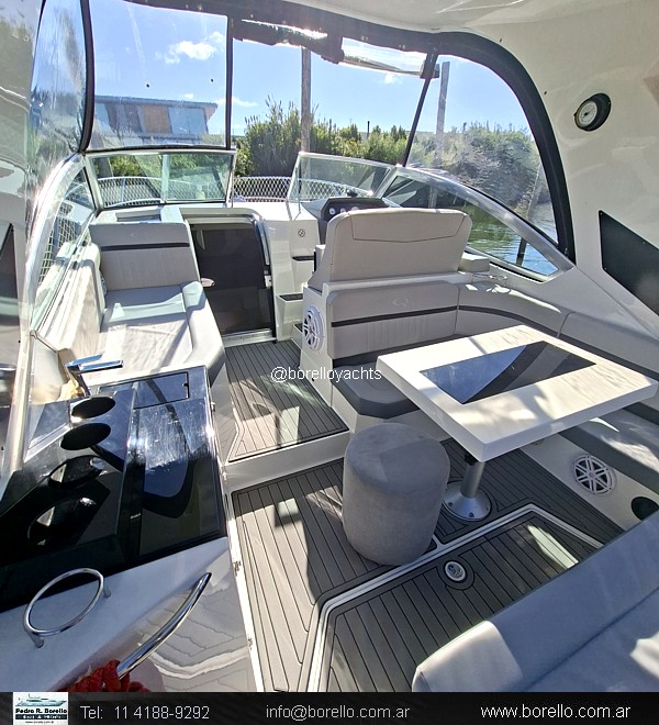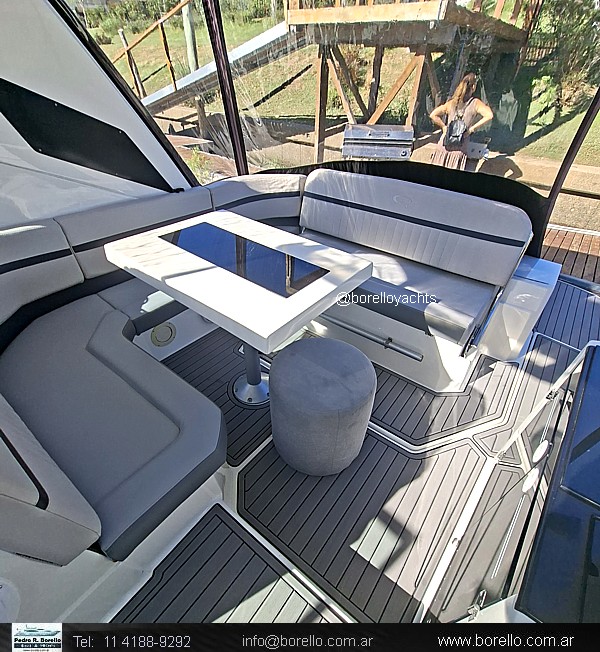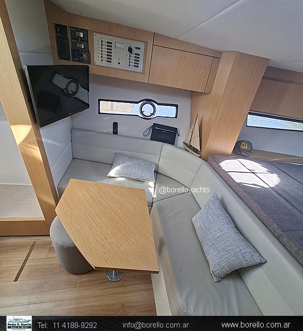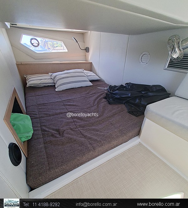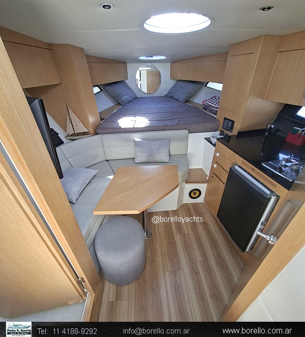 Cama doble en proa, sector cocina, sofá con mesa dinette, conejera doble en popa, baño compartimentado con ducha, cockpit con dinette, asiento timonel y acompañantes tipo sofá, plataforma de popa incorporada con puerta de acceso, solárium a proa sobre cubierta. |