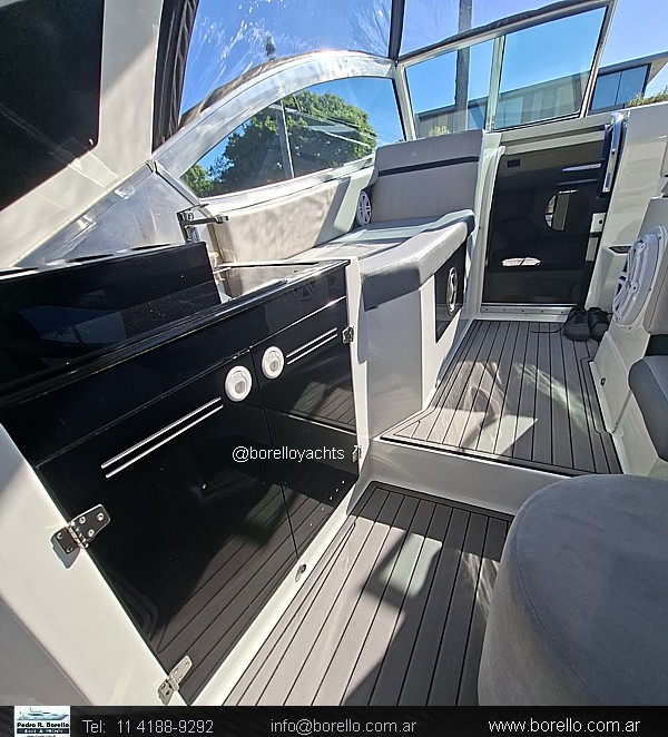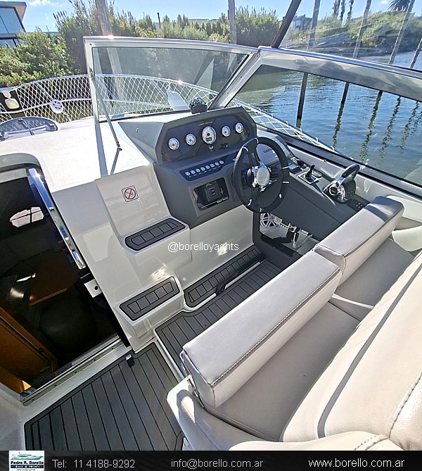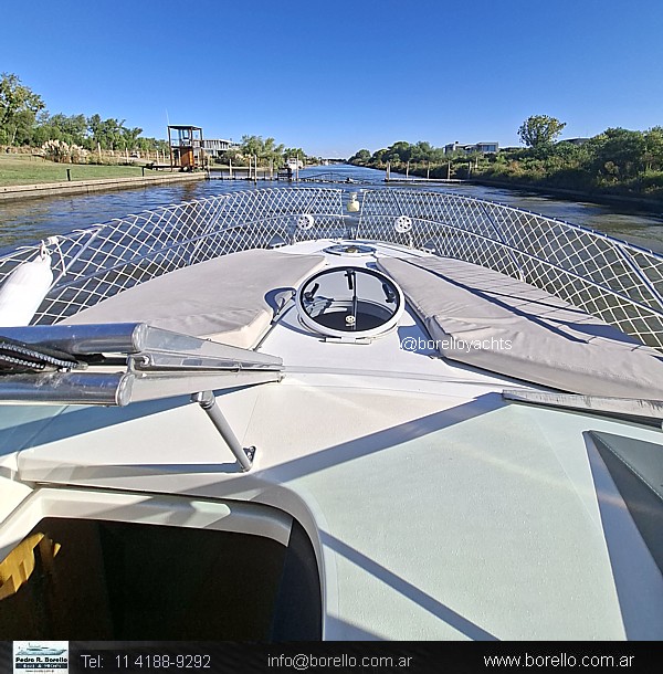VHF, ecosonda, compás, grupo electrógeno Diésel Coldmaster 5 Kva., aire acondicionado, calefactor, audio potenciado, hélice de proa (Bowthruster), fláps hidráulicos, parrilla eléctrica, horno microondas, heladera eléctrica, cocina eléctrica, malacate con ancla y cadena, TV, convertidor 127220 V., toma tierra 220 V., red perimetral en proa, colchonetas sol proa, techo rígido con ventana de vidrio al cielo y cerramiento de cockpit cristal, revestimiento de goma en pisos de cockpit y plataforma. (Dispones de video haciendo clic en la flichita roja). |
