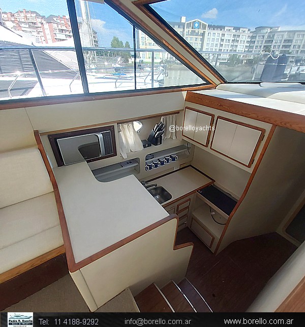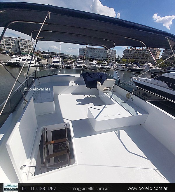 Amplisimo salón timonera con sofá en forma de L y mesa vidriada de acompañamiento, mueble de guarda sobre banda de estribor, cocina, camarote principal cama al centro con baño en suite con ducha compartimentada, camarote de invitados con dos camas paralelas con baño de invitados, cockpit con asiento banda a banda en popa, plataforma incorporada de generosas dimensiones, pasillos laterales hacia solárium de proa sobre cubierta, doble comando con muchísimo espacio. |