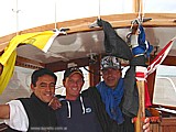 | Entrega de premios del Campeonato Brasilero RSX 2005 categoría Femenina, Catarina en 1º lugar, Patricia Castro en 2º lugar y Patricia en 3º ubicación, junto a ellas una de las personas encargadas de la organización del campeonato. | Entrega de premios del Campeonato Brasilero RSX 2005 categoría Masculino, a la izquierda Duter 2º clasificado, luego un organizador, a su lado Ricardo Winick (Bimba) ganador de la prueba y a la derecha Paulo Dos Reis (Campeón Brasilero de Formula Windsurfing) ubicado en 3º lugar. | Comisión de Regatas en plena tarea, 13 fueron las regatas corridas y todas ellas con una impecabilidad por parte de la organización digna de felicitar. Gracias a todos los responsables que permitieron que el evento haya sido un éxito total. |