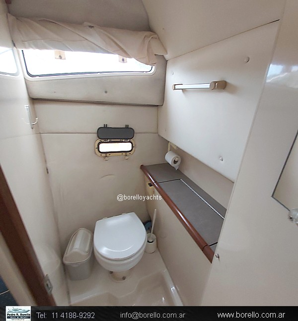 Mesa dinette a proa convertible en cama matrimonial en V, baño compartimentado con inodoro eléctrico, sector cocina, conejera en popa, cockpit con plataforma incorporada y puerta de acceso. Solárium a proa sobre cubierta con paso por parabrisas. |