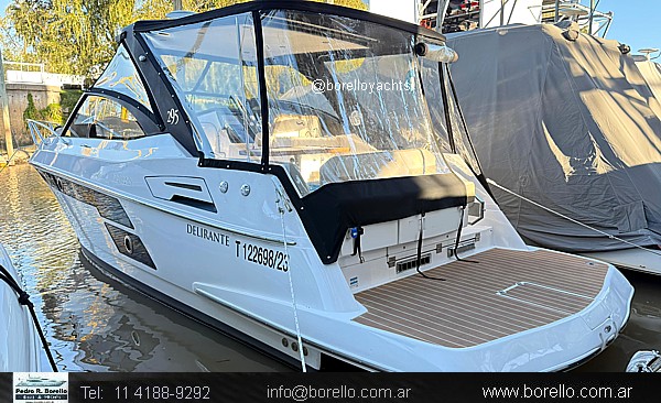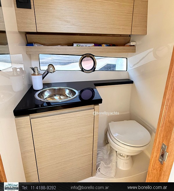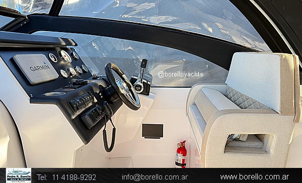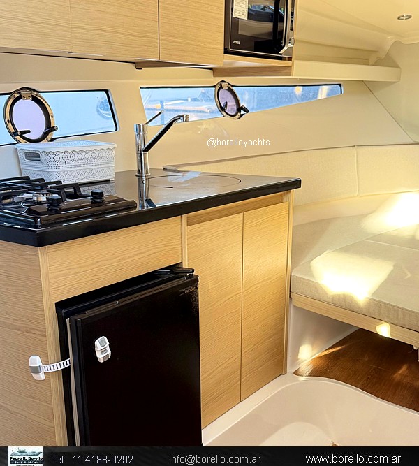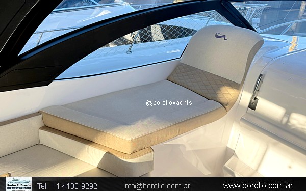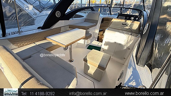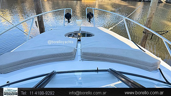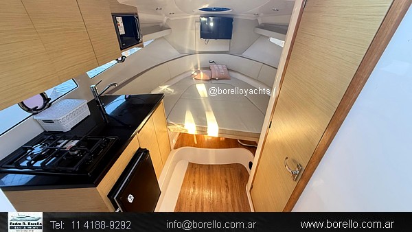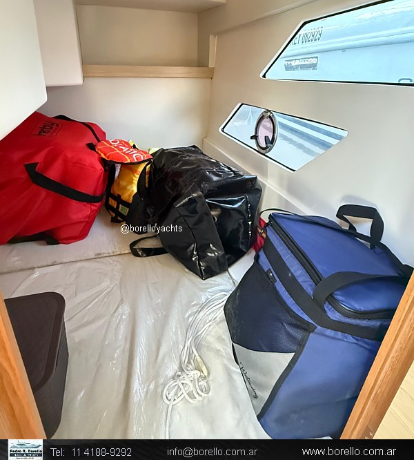 Cama doble a proa, conejera doble, sector cocina, baño compartimentado, buen cockpit con asiento timonel y acompañantes con mesa central. Plataforma de popa incorporada con puerta de acceso, solárium a proa sobre cubierta. |