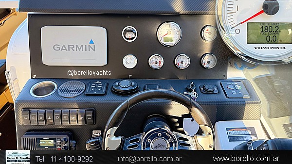 VHF, ecosonda, GPS Garmin, flaps hidráulicos, faro control remoto, hélice de proa (Bowthruster), audio, anafe, heladera eléctrica, horno microondas, bombas automáticas presurizadas todas, inodoro eléctrico, termotanque y ducha, duchador en plataforma de popa, toldilla y cerramiento de cockpit, colchonetas sol proa, toma tierra 220 V., convertidor 12/220 V. . |