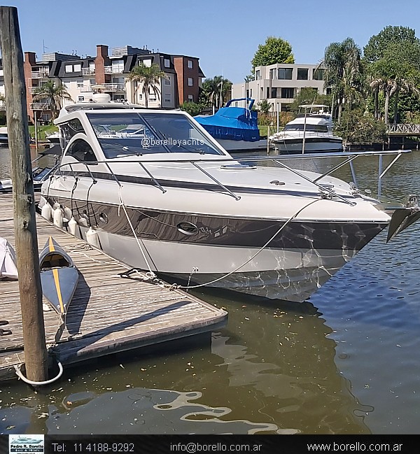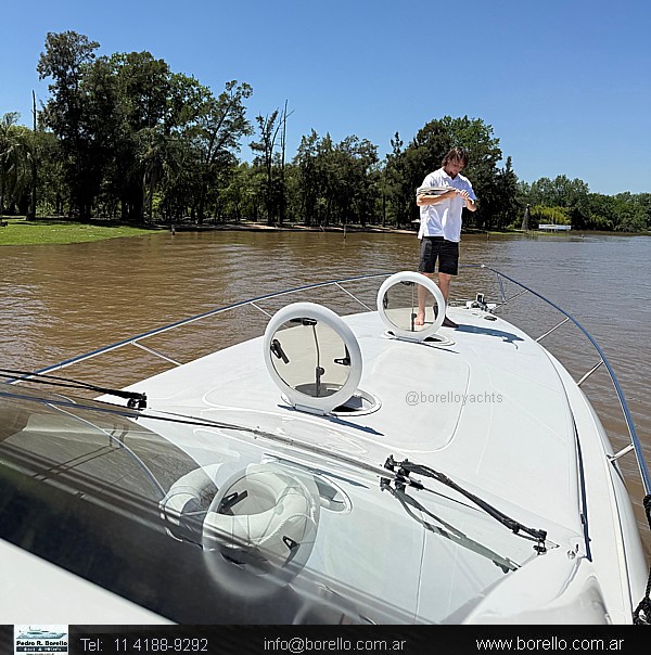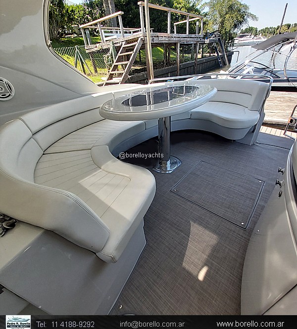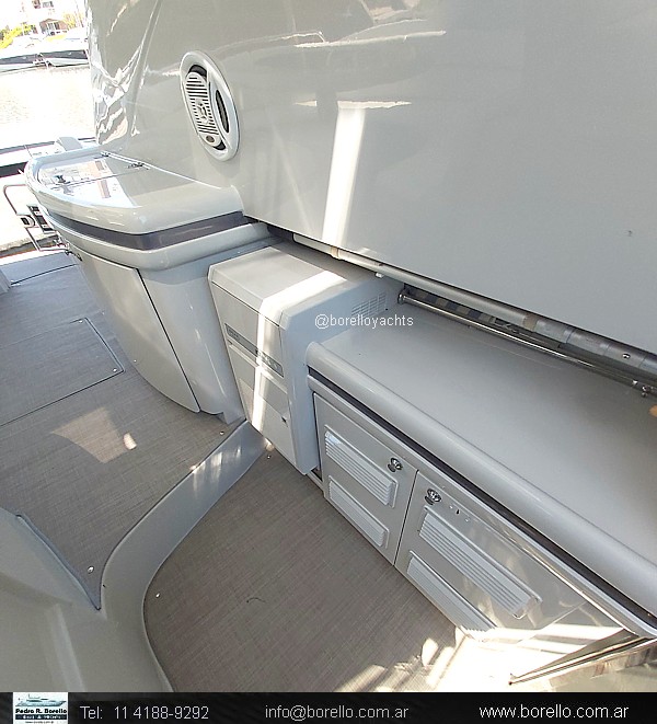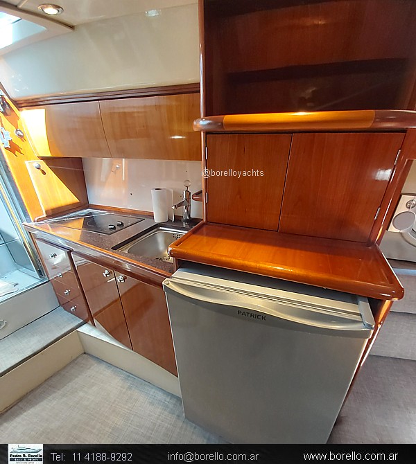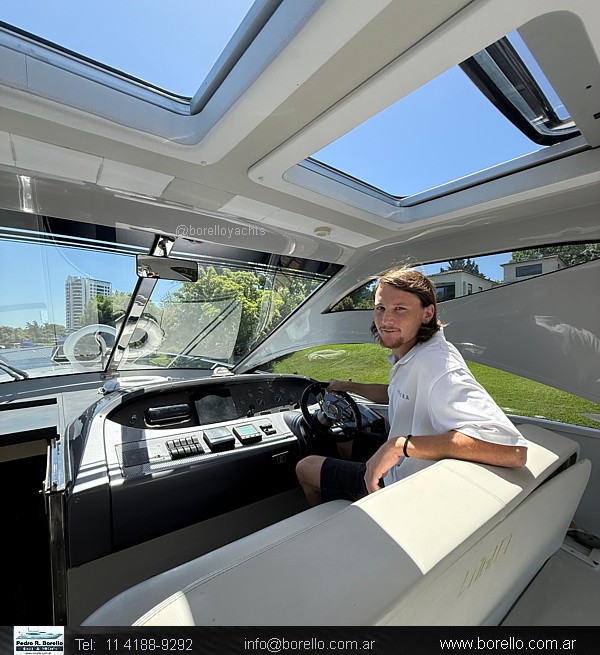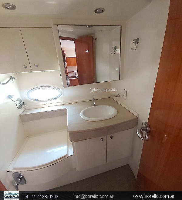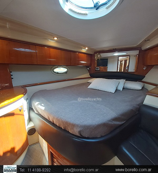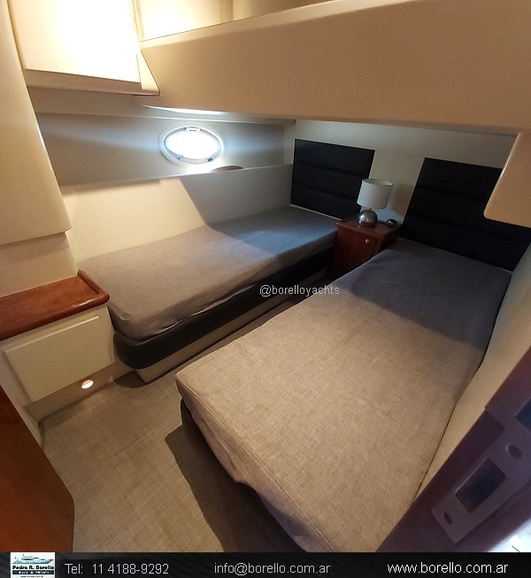 Camarote a proa cama matrimonial al centro, salón interior con sofá y mesa central con otro sofá enfrentado, mueble TV, sector cocina, baño con inodoro eléctrico y ducha, camarote de invitados de altura interior parado y 2 camas paralelas, cockpit techado con ventanas vidriadascon asiento timonel y acompañantes, sillón en semicírculo con mesa central, mueble con bacha, lugares de guarda y fabricadora de hielo, plataforma de popa de generosas dimensiones con puerta de acceso a cockpit, pasillos laterales hacia solárium de proa sobre cubierta. |